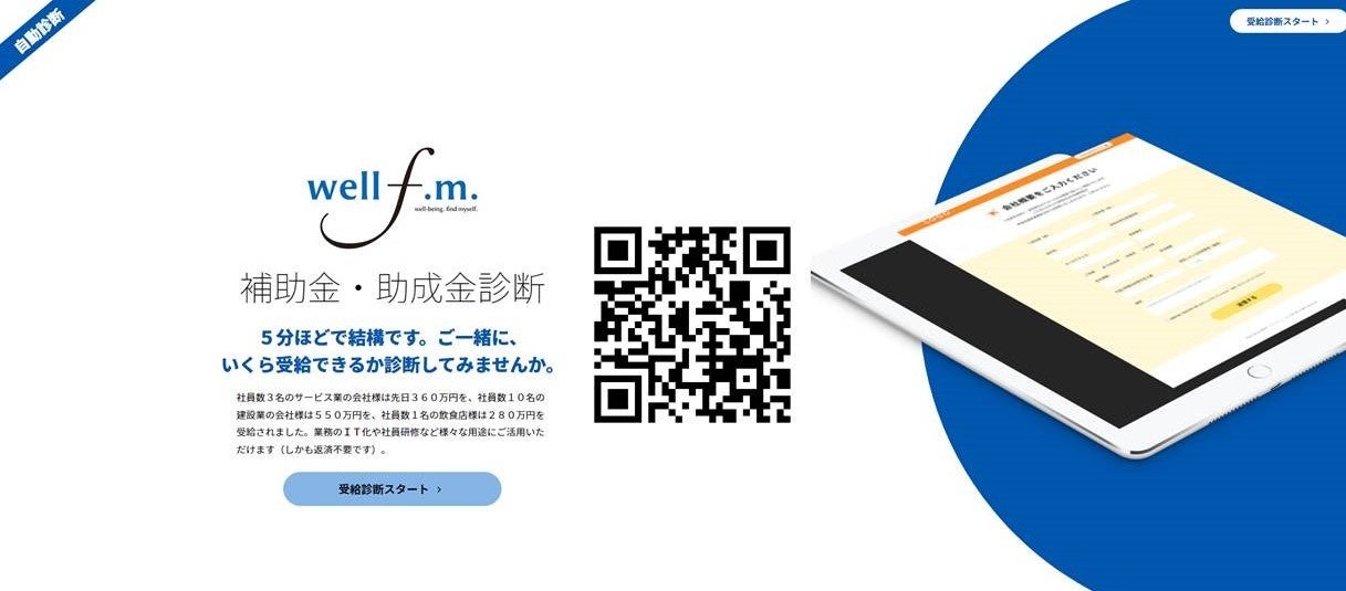 新型コロナウイルス感染症対応制度も含め、最新の補助金・助成金を各企業ごとに自動診断できるシステムをご提供いたします。インターネット上で、各企業ごとに受給可能性が高い補助金・助成金を数分で調べることが可能となります。※自動診断はこちら:https://shindan.jmatch.jp/writeup/?wellf.m