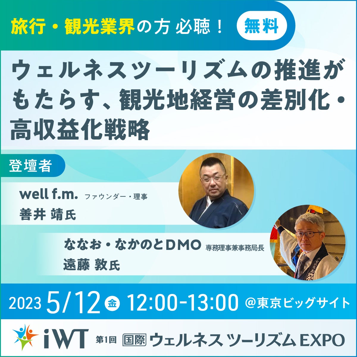 国内初開催となる【第一回国際ウェルネスツーリズム EXPO】 にて、5月10日10時より、well f.m.顧問 荒川雅志教授が、5月12日12時より、well f.m.ファウンダー・理事の善井 靖が講演させていただきます。