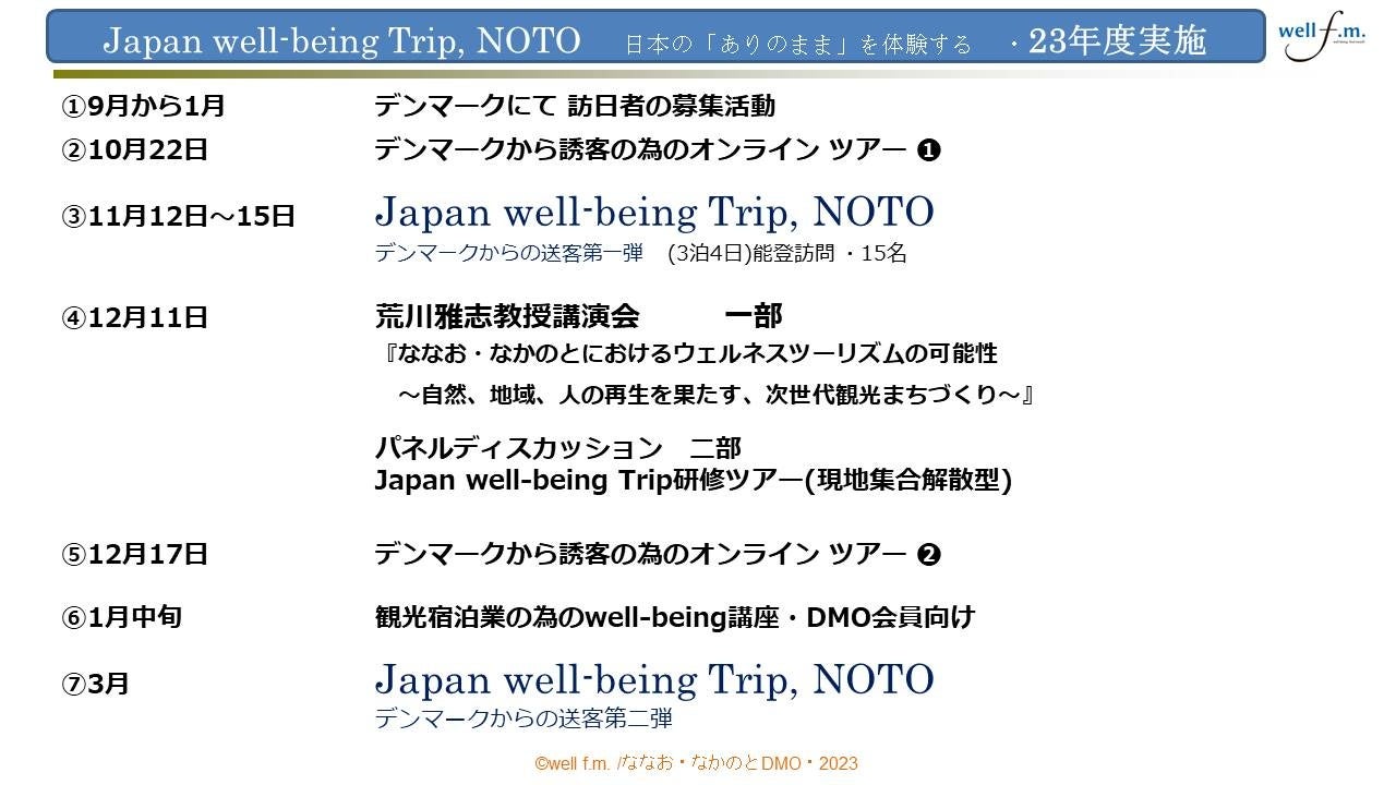 一般社団法人ななお・なかのとDMO(以下ななお・なかのとDMO)は、令和4年からウェルネスツーリズムに取り組んでおり、well f.m.との連携により、令和5年度より【日本の「ありのまま」を体験する】Japan well-being Tripを実施し、当DMOエリア(七尾市・中能登町)の「ありのまま」を体験して、これまで守られてきた自然、温泉、受け継がれてきた文化や風習、田舎暮らし等に魅力を感じていただき、今後は当DMOエリアの認知度向上と金沢からの能登へのインバウンド誘客を推進していきます。