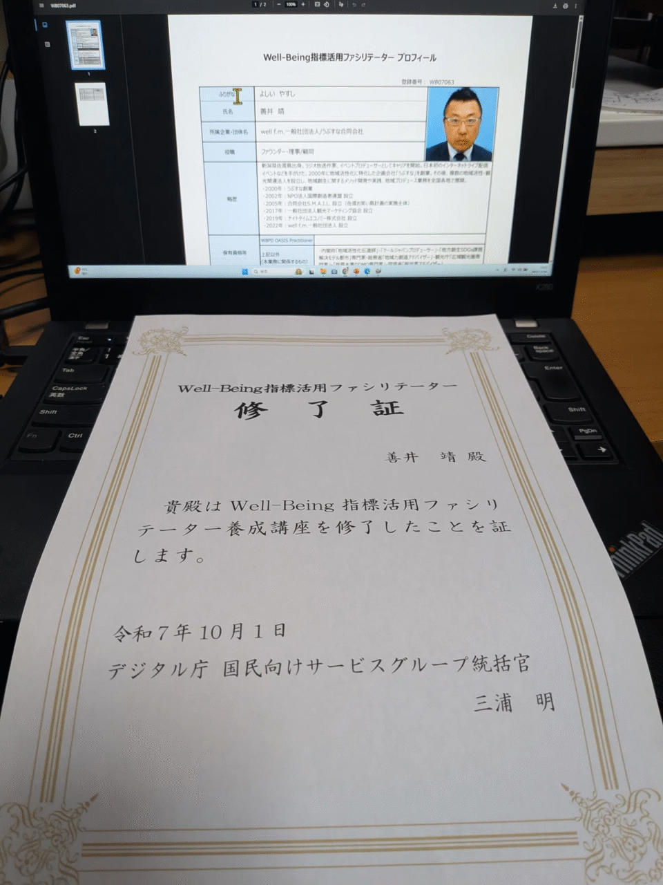そして、全国の自治体や企業における実装を支援する専門人材として、「Well-Being指標活用ファシリテーター」制度がスタート。このたび、私・善井靖もその一人として認定を受けました。