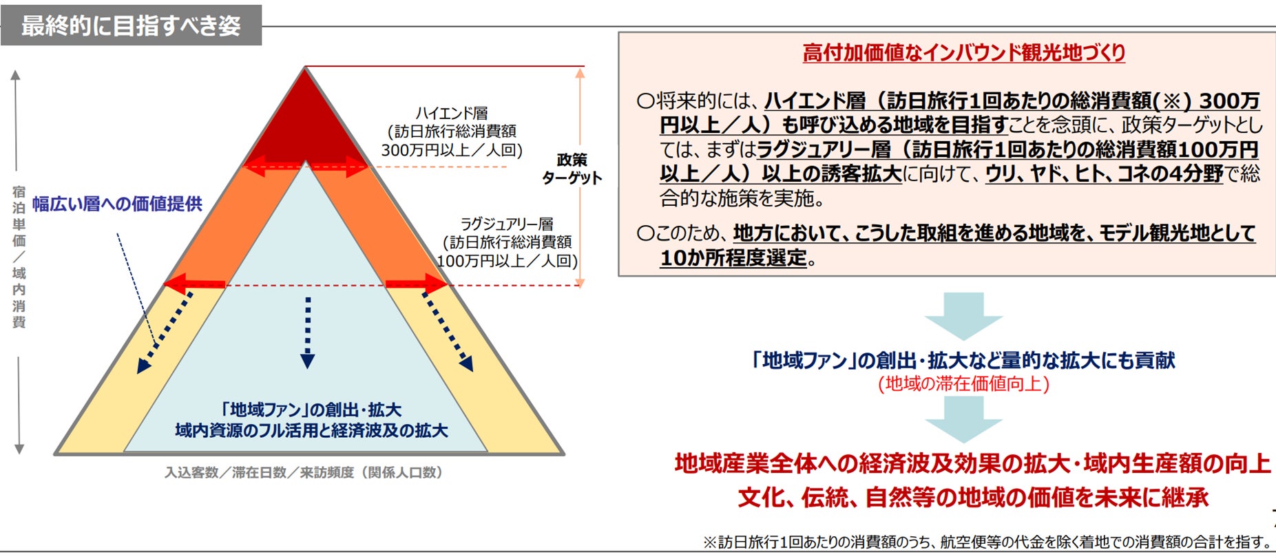 観光庁は「訪日旅行 1回当たりの総消費額 100 万円以上/人の旅行者」を「高付加価値旅行者」と定義し、高付加価値旅行者誘致を推進している。その意義としては、