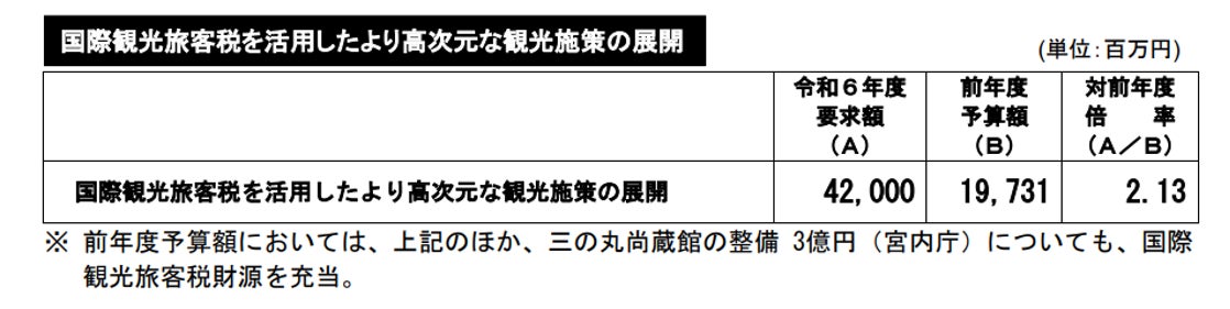観光庁は、令和6年度観光庁予算概算要求に「国際観光旅客税を活用した より高次元な観光施策の展開」として令和5年度比2.1倍の420億円を要求した。