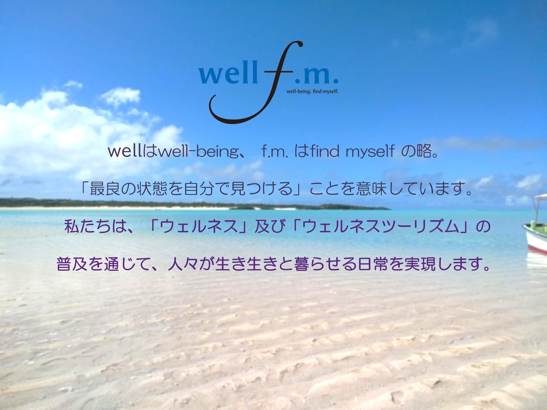 well f.m.一般社団法人は、大学教授、ウェルネスツーリズム実践者、アドベンチャーツーリズム 実践者、管理栄養士、温泉療養士、内閣府地域活性化伝道師等の理事で構成される「ウェルネス」 及び「ウェルネスツーリズム」「アドベンチャーツーリズム」の普及に特化した企画会社。顧問をウェルネス研究、ウェルネスツー リズム研究の第一人者である荒川雅志氏(国立大学法人琉球大学 国際地域創造学部 教授・ 医学博士)が務める。